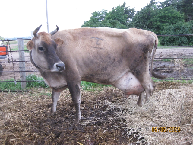 6 year old jersey cow, she is probably 1300 lbs., she has been machine milked, will give 10 gallons/day with 3 gallons of cream. She has a bad back hoof that makes her limp, gets around fine even in a big pasture. $1200, Call or text or message here 785-743-8o65.