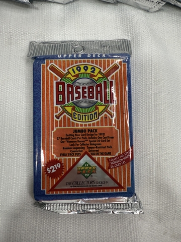 1992 Upper Deck Baseball Jumbo Sealed Packs. 27 cards per pack. $3 each, 14 packs available. Located in Plainville
