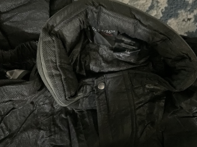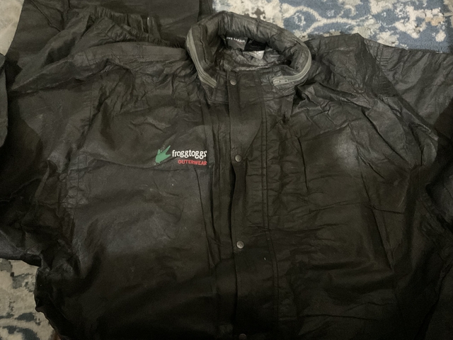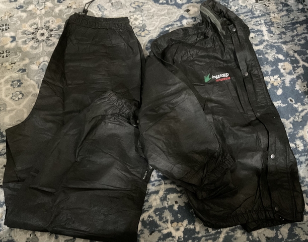 The Frogg Toggs Rainjacket & Pants in size XL are a waterproof outfit designed for men, made of polypropylene material and in a sleek black color. These are new without tags - bought for a motorcycle trip but we NEVER ENCOUNTERED RAIN.