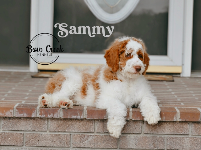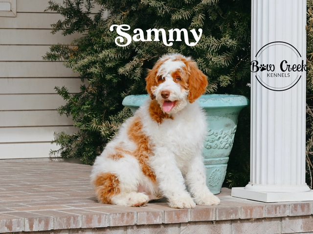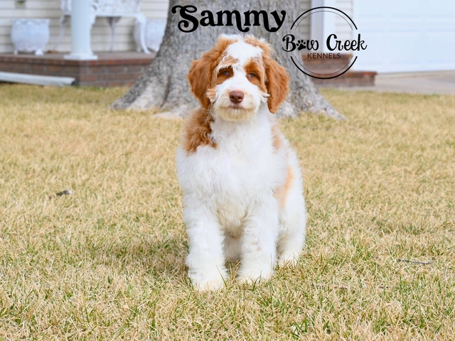 Sami is a fun, loving Brittany Spoodle (Brittany × Poodle) with a calm, gentle personality that is great with kids. He has a non-shedding coat, making him a great choice for families who want a cleaner home.