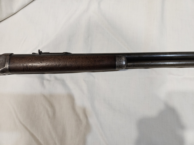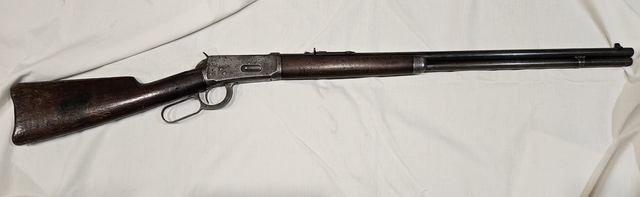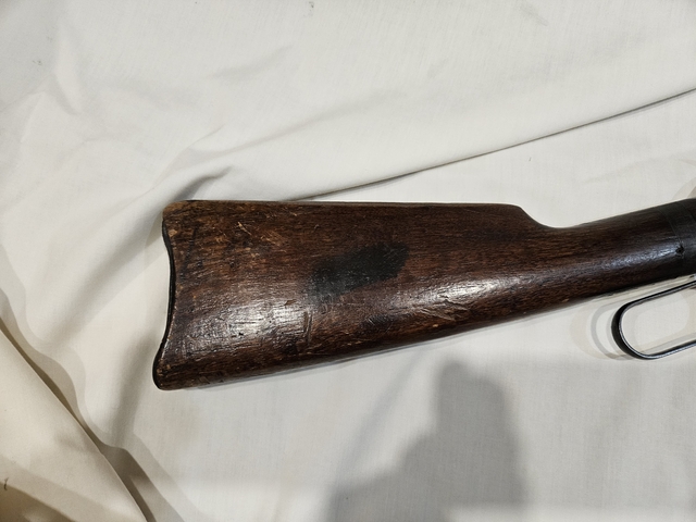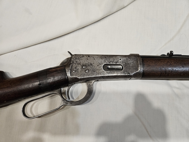 This 1894 is a functioning rifle, but a bit rough looking. The receiver has pitting and no blueing. The barrel and mag tube have some pitting at the tip. It has the buckhorn rear sight. This is a great wall hanger that can also go hunting. Three 1 six - six one 9-9 nine six nine.