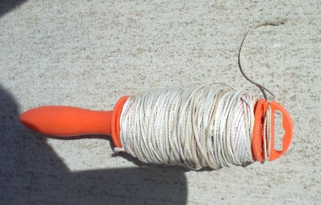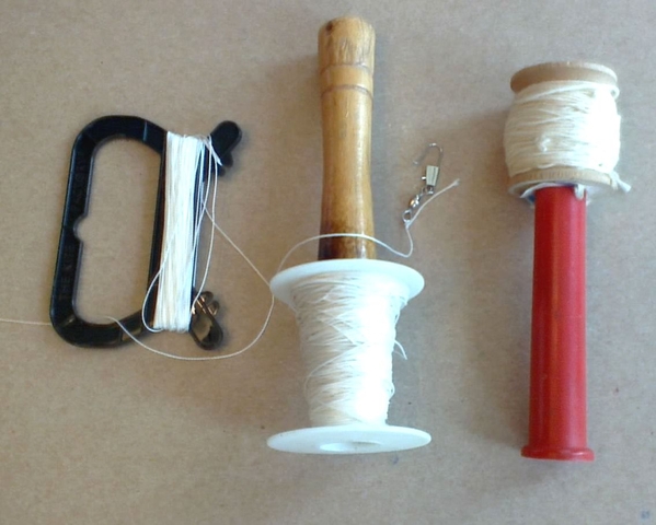 7 Kite String Spools - $8.00 Selling seven spools, kite string winders or handles with kite string. Spools vary from approximately 100’ to 500’ length for the largest spool. Most are 10 to 18 gauge strong braided nylon string.
