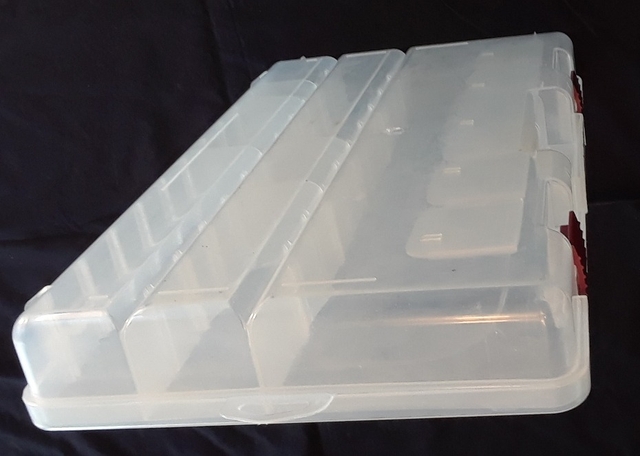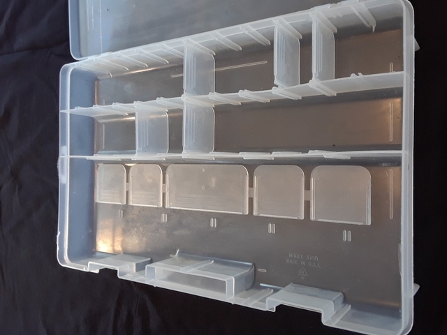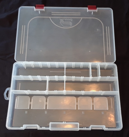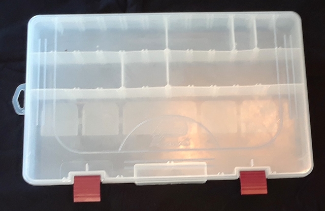 Fishing Tackle Lure Box - $8.00 Plano Brand ProLatch 3700 StowAway Organizer Box. With a transparent design to quickly identify fishing tackle, lures, hooks, etc.. stored in the box. Material – Polypropylene, Two latch closure style. Height=2”, Width=9”, Length=14”. 8 adjustable divider pieces can make 14 separate compartments.