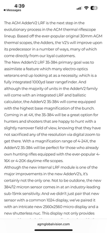 Brand new never been used. The scope hasn't even been mounted on a rifle and sighted in. Still has 5yr warranty. Purchased Feb 2025. Just haven't had the time to sight it in and don't for see anytime to go out and use it. If you have any questions ask or can look up the info on the agm website.