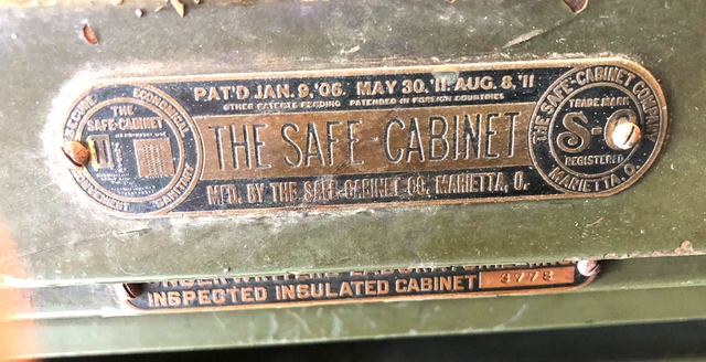 MFG by Safe Cabinet Co., Marrietta, G. Pat'd 1906, Inspected Insulated Cabinet