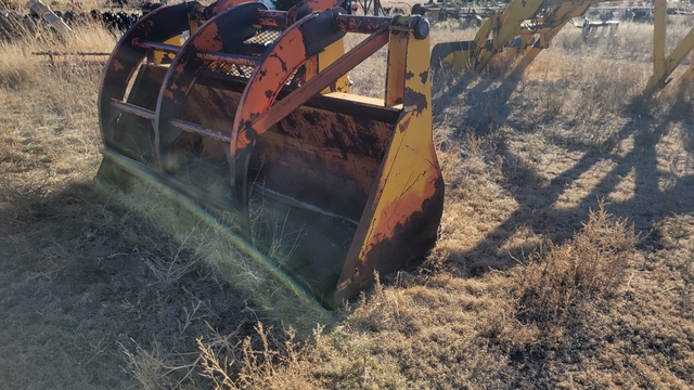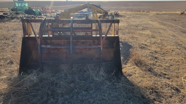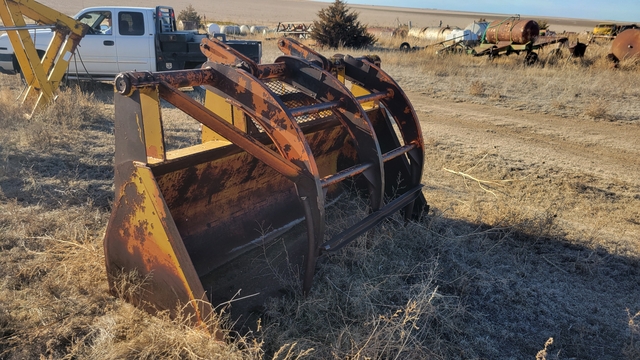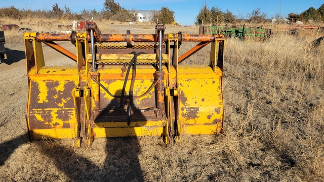 920 CAT Loader Bucket With Heavy Duty Grapple Fork--Dual Cylinder, Bucket Mount 38" Inside, 43" Outside, Bucket Width 96", Pin Holes 1.75", Bucket Teeth, $2000--Brent Cook Retirement--(785) 82One-1One32--Click on "Timer" to see my other listings.