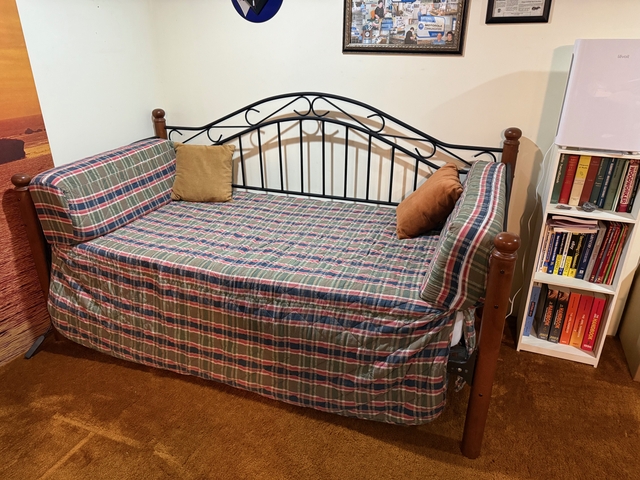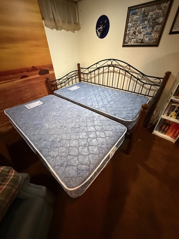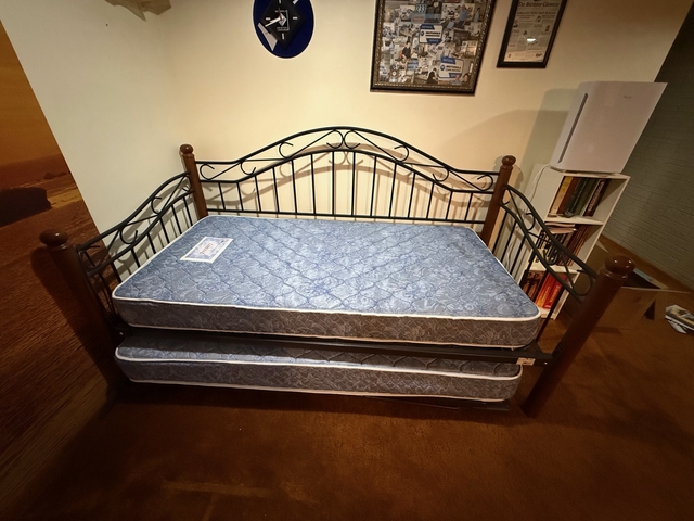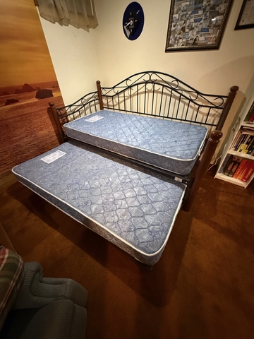 A rarely used daybed with a trundle that fits underneath, two single mattresses in great shape, metal with wood posts. When the trundle bed is up, it makes into a king bed. No smoking and no pet environment. Cover and pillows included. Free to anyone who can carry it upstairs from a basement with easy access to the outside. It comes apart. It has to be removed by Thursday noon, July 3, 2025. Call Amber at 720-480-5234 with questions or to arrange to pick it up.