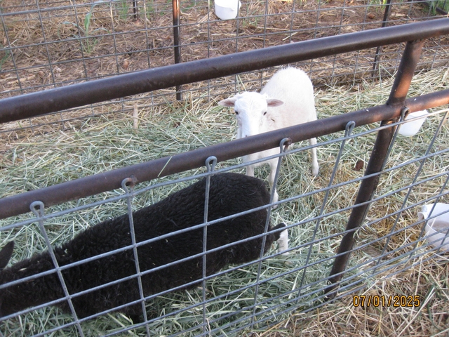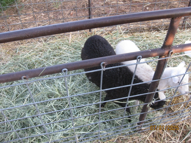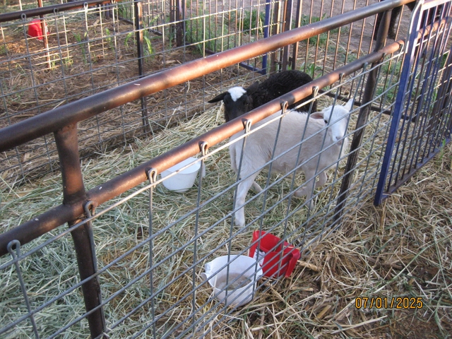 Black lamb is ewe, white is ram, they were both triplets, were bottle raised, sweet and gentle, follow you anywhere, like chasing a side by side. Eating hay and grain. Should breed for spring lambs. They are Dorper, Katahdin cross. $300 each, want them to stay together, $600 for the pair, Call or text or message here, 785-743-8o65