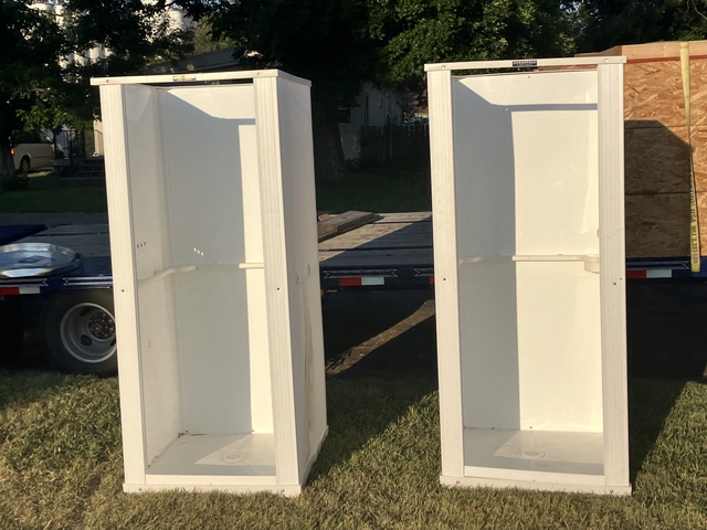 Mustee durastall self standing shower stall. Used 5 days. Can be installed anywhere as long as drain can be hooked up. Comes with all hardware and faucets. 32"x32"x68". $300 takes both or $200 for one. Seven eight 5-67two-five one70. No Sunday calls