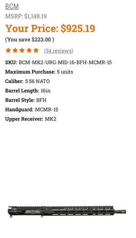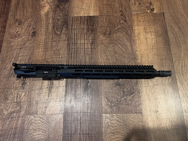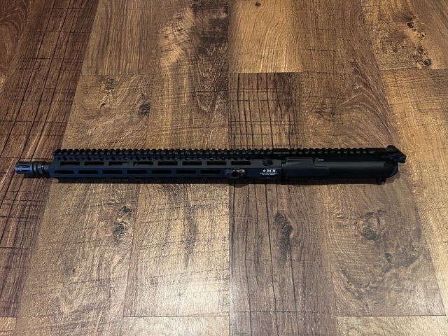 I'm selling my BCM MK2 BFH 16" Mid Length Complete Upper Receiver Group for a 12.5 upper. This has been exceptionally accurate as you can see in the photos shooting Frontier 75gr BTHPs. This will come with the BCG and charging handle. These uppers normally go for $925 without BCG and charging handle. It only has about 200 rounds thru it.