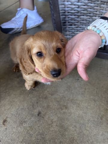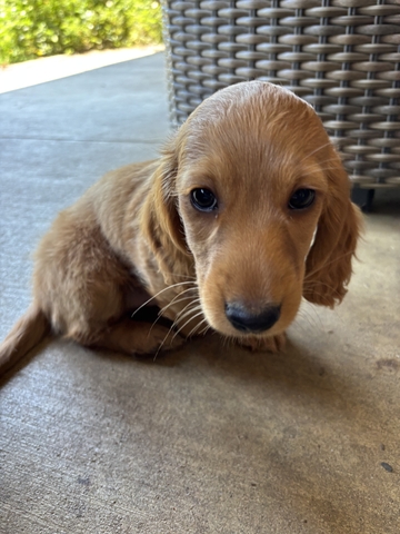 Longhaired Cream Miniature Dachshund. Male born 6/8/25 will be ready first week of August. Willing to travel! Message for more info at 7856207705
