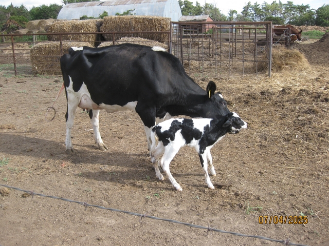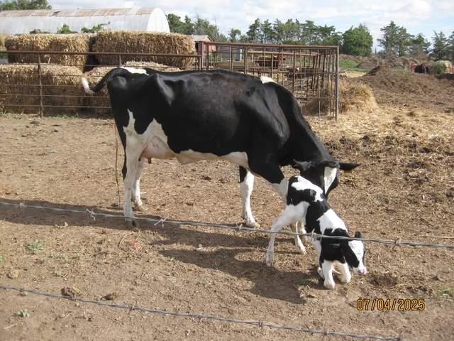 Nice, gentle Holstein 1st calf heifer and heifer calf, now bred back to a Black Baldy bull for a late May calf next year. Heifer has very nice big even bag, could slide into a dairy operation.$3200 for the bred heifer, $800 for the calf, $3800 for the 3 in 1, call or text or message here, 785-743-8o65
