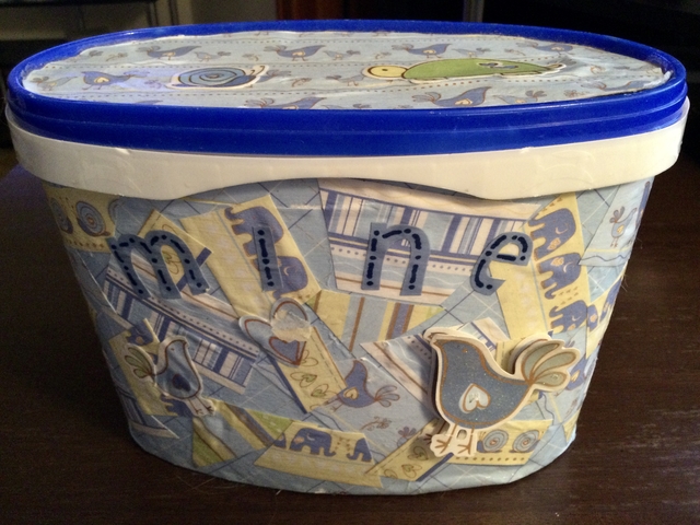 An EXAMPLE ONLY in next to last photo : Quite awhile back I decopauged a plastic ice cream container that says "MINE" for the cut threads that sits by my sewing machine