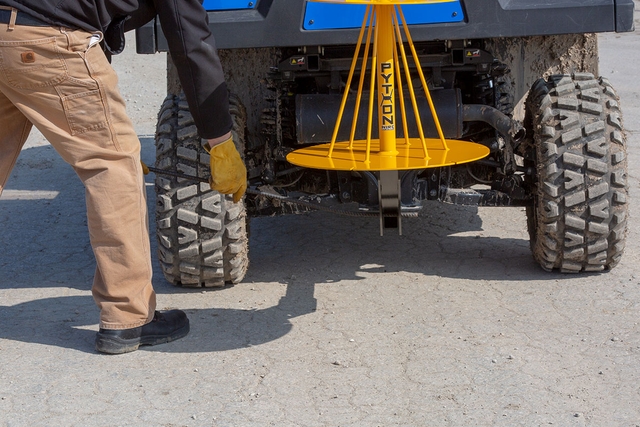2" receiver/trailer hitch connection. Rebar and T-post straightening holes. Wire tensioning hooks. Rubber disc reduces backlash. Accepts most new spools of wire or bundles wound using Python Wire Winder. Toolless operation.