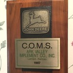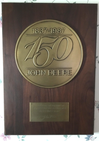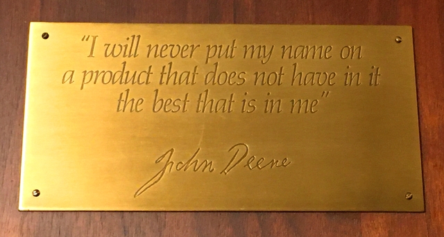 BRASS PLATE ON PLAQUE SAYS: "I WILL NEVER PUT MY NAME ON A PRODUCT THAT DOES NOT HAVE IN IT THE BEST THAT IS IN ME", JOHN DEERE
