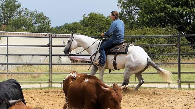 They just don’t come any prettier than Arnold. He’s absolutely astonishing! He is a true blue roan, without a red hair on him. Arnold rides just as good as he looks.