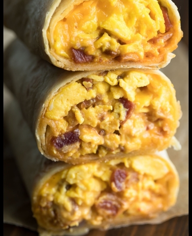 BREAKFAST BURRITOS Loaded with sausage and/or bacon, eggs, hashbrowns & cheese