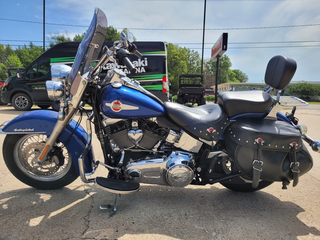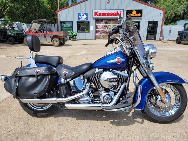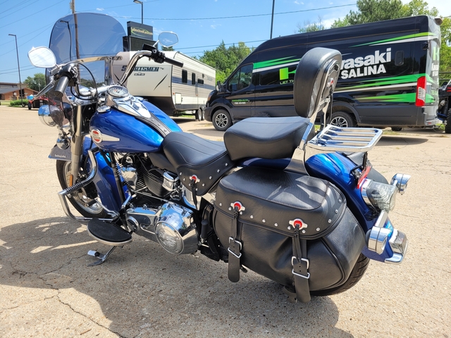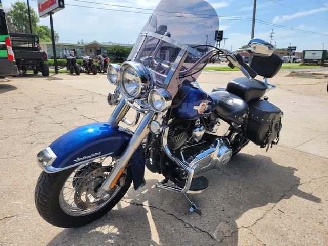 A beautiful blue 2017 Harley-Davidson FLSTC Heritage Softail with 12020 miles, mustache bar/engine guard, electronic cruise control, Vance & Hines exhaust, Factory H-D smoked windshield, bags and backrest. 103ci V-Twin Engine, 6-speed transmission - $10500 - See more at www.kawasakiofsalina.com or call 785-404-1613