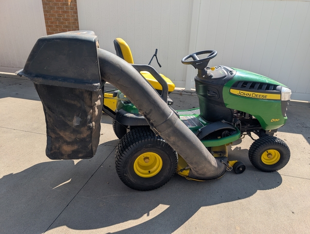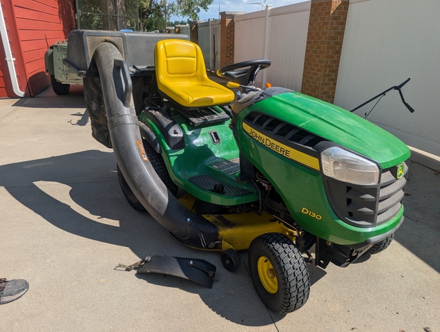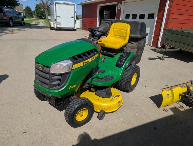 2011 John Deere D130 riding lawn mower in like-new condition with only 290 hours. Powered by a 22HP Briggs & Stratton engine with a 42-inch deck. Comes fully equipped with bagger, mulcher, snow blade with two weights and chains, and front bumper guard. Recently upgraded with new battery and new mulcher.