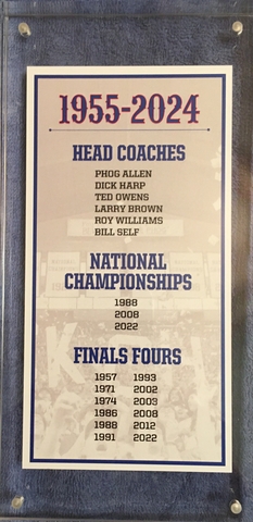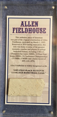 THIS IS A HEAVY ACRYLIC DESK DISPLAY CONTAINING AN AUTHENTIC PIECE OF LIMESTONE FROM ALLEN FIELDHOUSE. IT MEASURES 10" HIGH, BY 5" WIDE, BY 1" THICK. THE PIECE OF LIMESTONE WAS REMOVED FROM THE ORIGINAL 1955 CONSTRUCTION IN 2024, DURING RENOVATION.