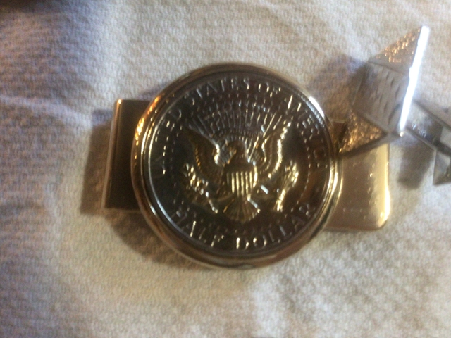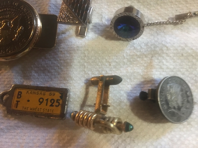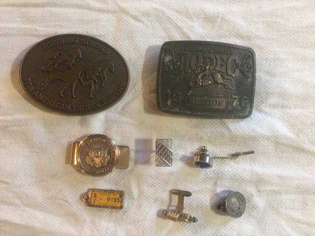 1960 Cinco Centavos coin made into tie clip, Running Stong for American Indian Youth vintage, never worn belt buckle, 1976 Hesston belt buckle, never worn but has a little discoloration, mouse urine?, Half Dollar made into money clip new in box, Two unmatching cuff links, Blue glass tie tac with chain, DAV 1959 BT/KS key chain tag. Everything in this ad for $10 firm. No checks, no delivery, no texts, no to wanting my email address, no to everything except 25 💰. Contact me here or @ 620792549eight. Keep trying, it's a no text phone.