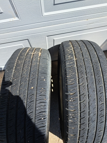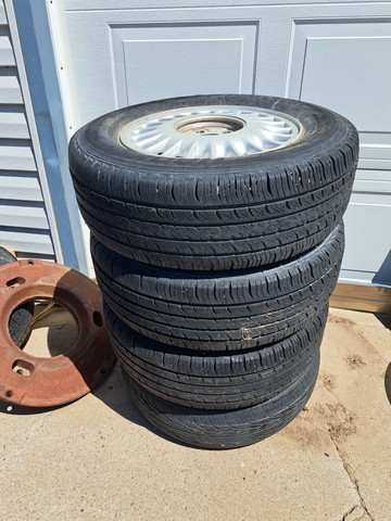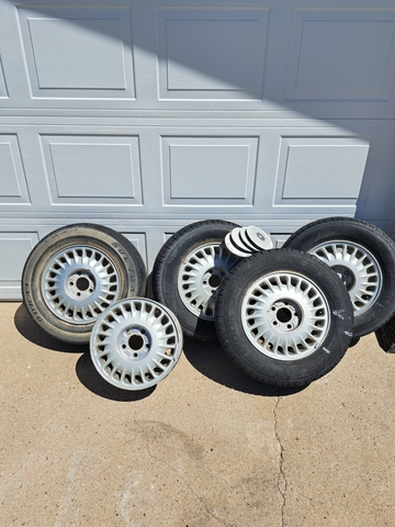 Full set of five 15 inch Buick wheel rims. Four have tires on them. Three are in very good shape with lots of miles left on them. 4th was a spare tire I used. It is on fair shape, just different. The tires are P205/70R15. 95T Hankook Optima. The spare is a Doral. Comes with lug nut caps for the rims. These came off from a '95 or '97 Buick but fits any car with 15 inch rims.