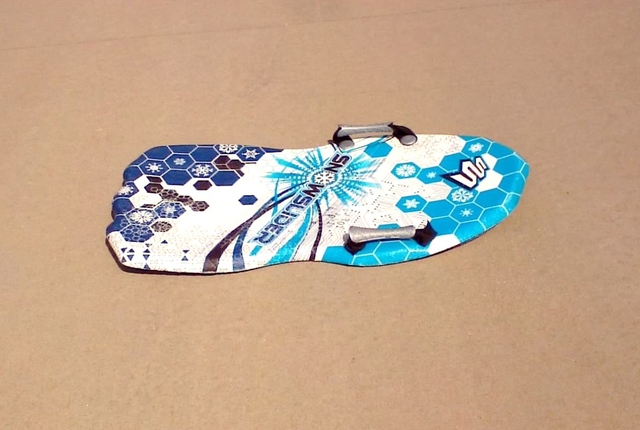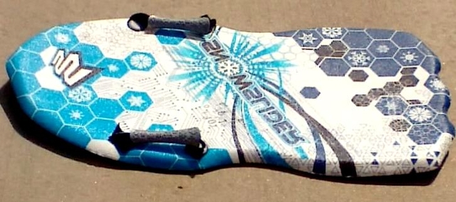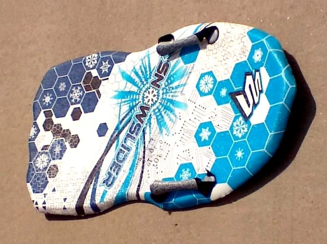 Snow Sled - $15.00 Molded foam boogie style sled with outer plastic shell. Black White & Blue sled 35” long.