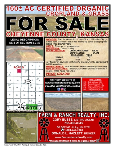160± ACRES CERTIFIED ORGANIC CROPLAND & GRASS - CHEYENNE COUNTY, KS