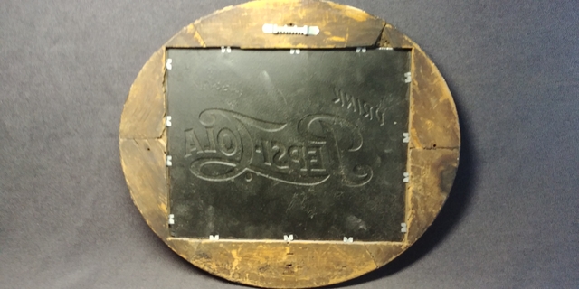 A part of a Pepsi cooler or machine that has been fit into a antique frame for display.