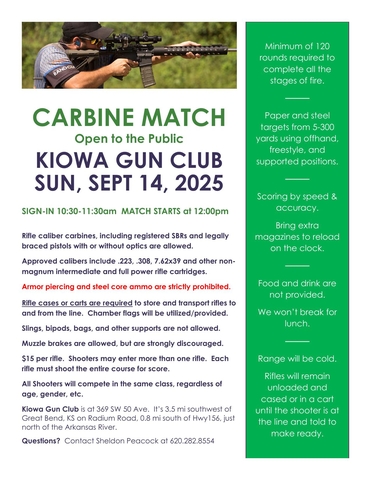 Kiowa Gun Club in Great Bend,Ks hosting carbine match Sunday September 14th. See flyer for details.