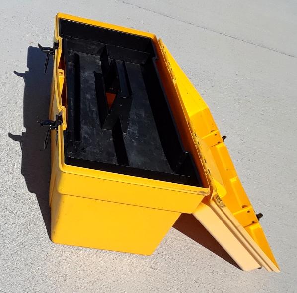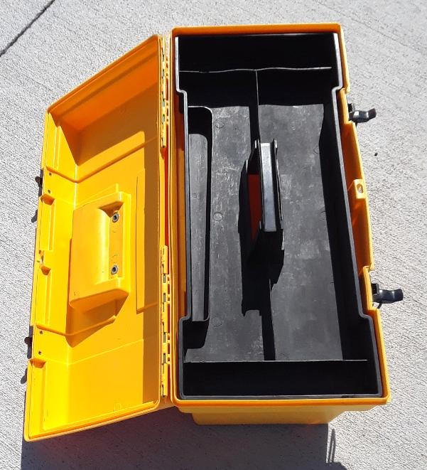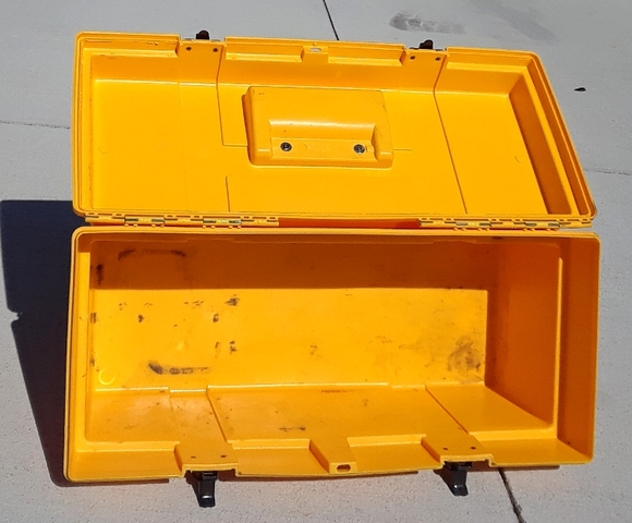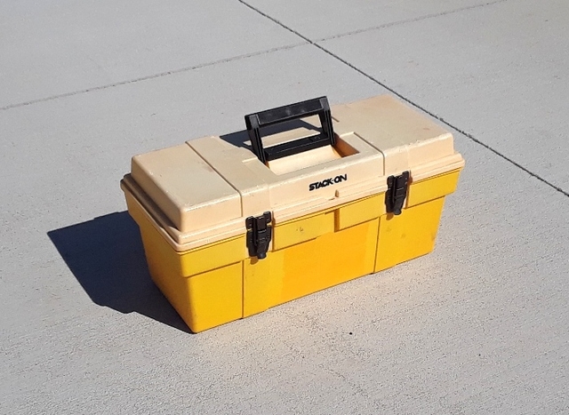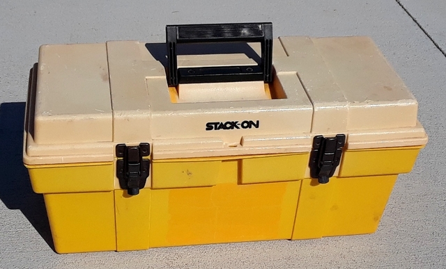 22” Stack-On Tool Box - $10.00 Multi use plastic box for tools, farm supplies, camping or a variety of other gear and hobby or craft items. Dimensions” 22” x 10” & 10” tall with a 5 compartment tray. Two metal latches – In very good condition.