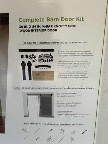I have for sale a New in the box 36x84 Knotty pine barn door kit. Door plus all the accessories to hang. I bought it for my basement and was going to cut it down 8" but decided to go another route. Paid $284 new. Located in Norton Ks. Cash only NEED IT GONE AD IM PAINTING GARAGE WALLS.