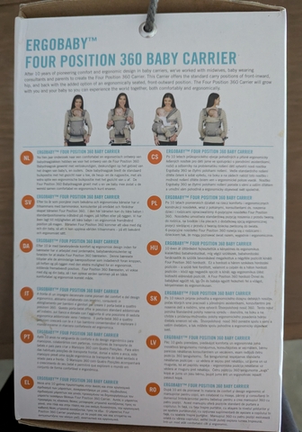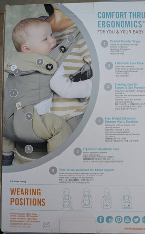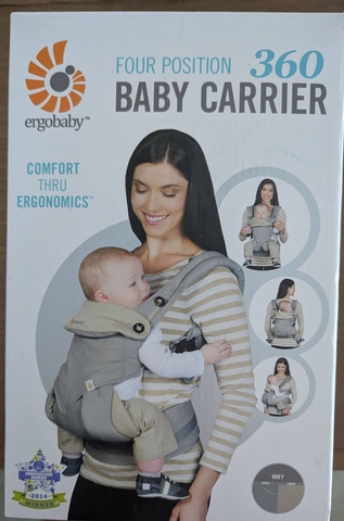 Ergo 4 wearing position 360 Baby Carrier. Heavy duty; new in box. Color: Grey. 4 mos. - 4 yrs.. Padded shoulder straps. Extendable back panel. Sleeping hood for support and sun protection. Even weight distribution between hips and shoulders. Ergonomic adjustable seat. Wide velcro waistband for added support. Machine washable. From smoke/pet free home. $30.00