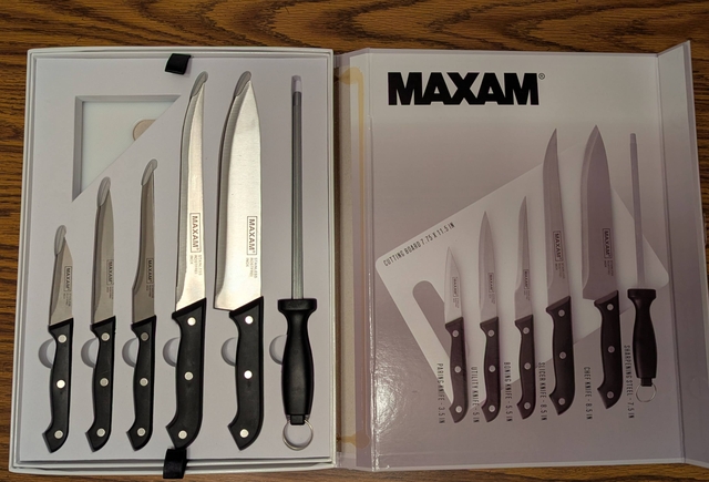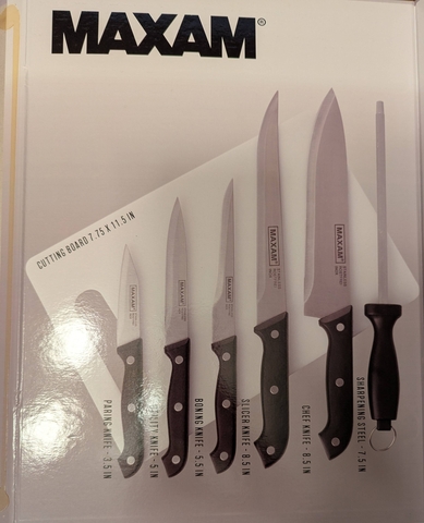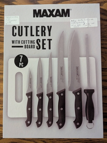 New Maxam 7 pc cutlery set. Five piece knife set w/sharpening tool and cutting board. Knife sizes are shown in pictures. Great gift idea! $20.00. Smoke/pet free home.