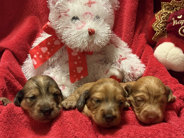 Valentines Beautiful Miniature Dachshund comes with first shots, wormed, full health guarantee, full registration, veterinary health certificate. Both parents are on site, willing to meet halfway for puppy pick up. Full price is $1,000 call or text for additional Chocolate and Tan Pieball, Cream
