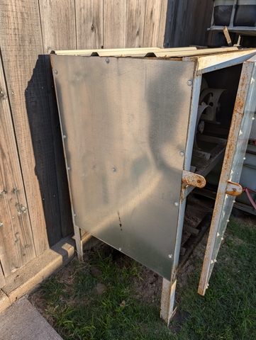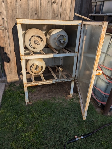 steel lockable cabinet to store (4) 20lb. propane bottles, 32 inches x 26 inches x 35 inches tall plus 12 inch legs