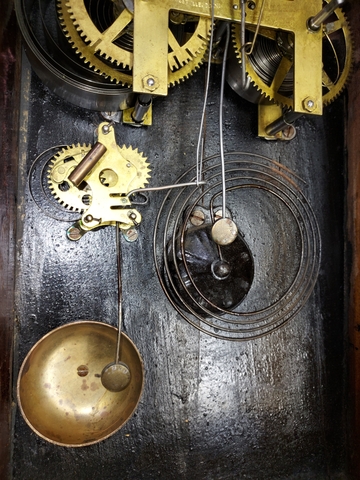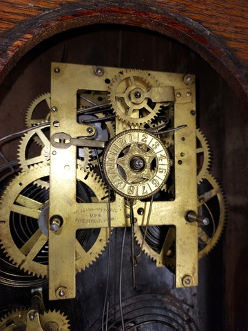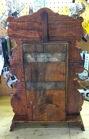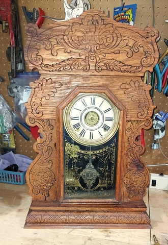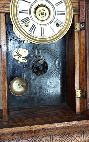 This is for a Sessions Gingerbread Oak 8 Day Mantle Kitchen Clock & Key Antique CIRCA 1900. This Sessions Gingerbread Oak 8 Day Mantle Kitchen Clock is an antique collectible that exudes charm and elegance with its brown oak finish and intricate design. This vintage clock, manufactured by Sessions around the turn of the century, features a unique 8-day half hour strike function plus an alarm and is made of wood, glass, and metal materials. Measuring 25" TALL, 15 1/2" WIDE, and 4" DEEP. This original antique piece is a perfect addition to any room in your home, particularly the kitchen, living room, or bedroom. The clock also includes a key for winding and a very attractive pendulum. It is a cherished item for collectors of vintage timepieces.