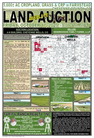 AUCTIONEER’S NOTE: Hendrickson Family Farms, LLLP will sell this 5,600± acres of cropland, grass & CRP w/farmstead at ABSOLUTE PUBLIC AUCTION on Friday, October 17th @9:30 AM MDT, at the 4-H Building in Cheyenne Wells, Colorado.