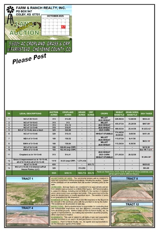 This is an EXCELLENT OPPORTUNITY TO PURCHASE LARGE ACREAGES of cropland and pasture in 14 individual tracts. TRACTS 1, 2 & 3 consist of nearly 950 contiguous acres of cropland. TRACTS 4 thru 8 & 11 are either contiguous or in very close proximity to each other for another nice block of cropland! TRACTS 9 & 10 are expired CRP. TRACT 13 is a section of CRP enrolled thru 2030. TRACT 12 offers a large pasture with an older farmstead where the well is located. TRACT 14 is a ½ interest in a half section of grassland. All of the Seller’s interest in the mineral rights are included, and possession of the open ground will be after the auction. Don't miss this opportunity to buy land in a productive region of Cheyenne County, CO.