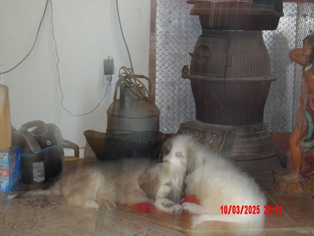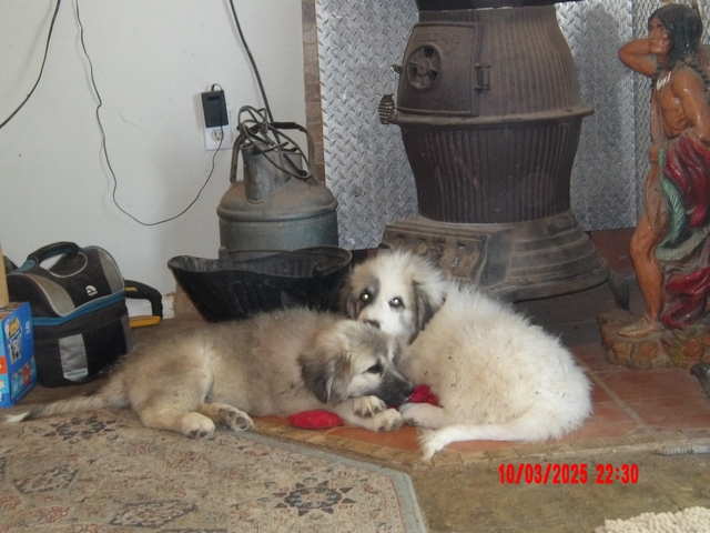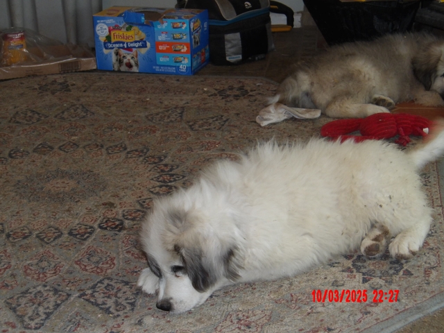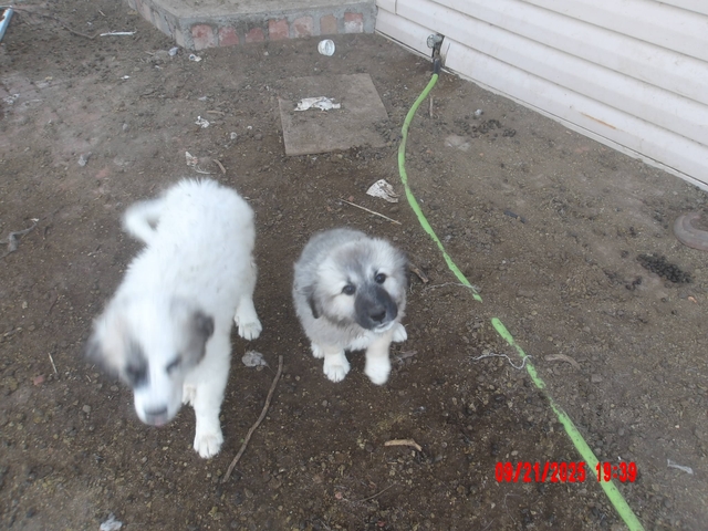 We have 2 pups one male an one female just took some new picture this morning the white pup is the male darker one the female need a new home soon. getting bigger every day