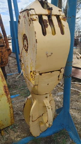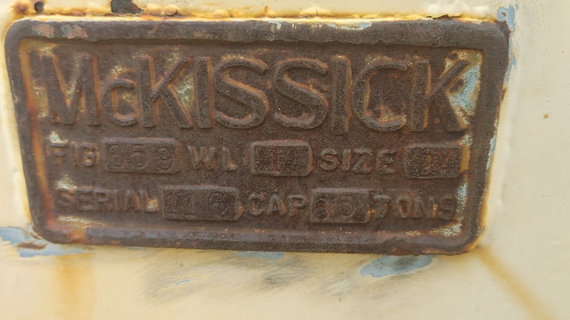 This is a heavy-duty 3-sheave - 7/8" groove 65-ton McKissick crane hook block, Model/Fig 659, complete with a Web-Wilson Hydra Hook and swivel.
