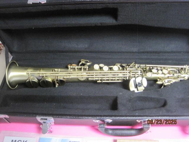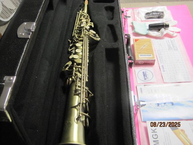 A brand new Yamaha 875 Custom EX soprano sax. Finished in an antique brass w/clear epoxy. Has all Yamaha branded paperwork, warranty card, case, and logos. I have test played it, and did not think any additional adjusments were needed. You will need much better reeds to hit hi-F/F#, and maybe the mouthpiece should be upgraded also, but the horn is air tight and all regulation looks proper. I was a Coast Guard band repairman in NYC, and have worked on most brands.