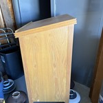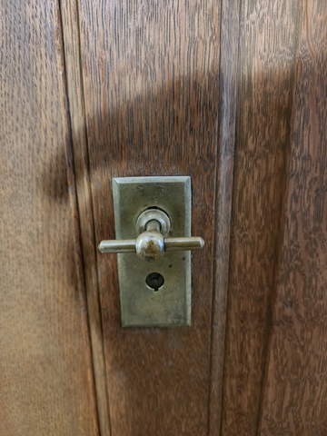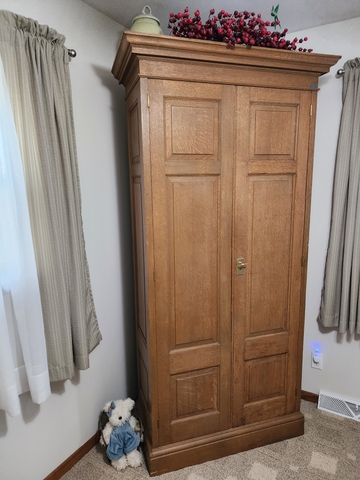 I have an older solid oak cabinet. The cabinet is in incredible condition and it has the original brass locking system with a T-handle with rods to lock the doors into place. The inside of the cabinet has a top shelf and right below the shelf are 5 coat hooks in case you wanted to use it as a coat closet or use it for other storage. The cabinet stands 7 feet tall and is 41.5 inches wide including the extruded molding at the top and 20 inches deep including the molding at the top. This cabinet is a piece of history and I have owned it for many years now. I am asking $600 which is extremely reasonable for the workmanship and condition of this piece. Please ask if you have any questions.