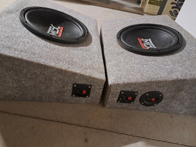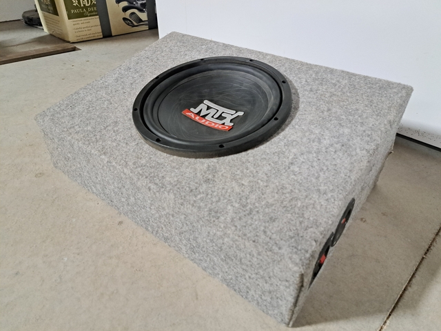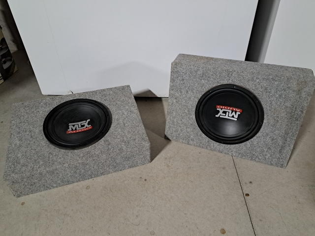 I have two 10 inch MTX TN10-04 subwoofers with enclosures. Enclosures are made with MDF and are carpeted. I have used them both laying flat under a back row of seats in a crew cab pickup and standing upright behind a seat in a single cab pickup. The enclosures have the needed terminals for speaker wire. Asking $40 OBO for the pair.