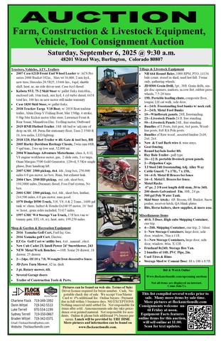 Pictures can be found on web site. Terms of Sale: Driver license required for buyer number. Cash, Negotiable check day of sale. We accept Visa/Master Card w/ 4% additional fee. Online buyers– Payment due in full within 3 business days. NO EXCEPTIONS. Nothing removed until settled for. Not responsible for items after sold. Announcements sale day take precedence over printed material. Not responsible for accidents. Online & phone bids additional 3% buyers premium. Lunch will be provided by THE DISH.
