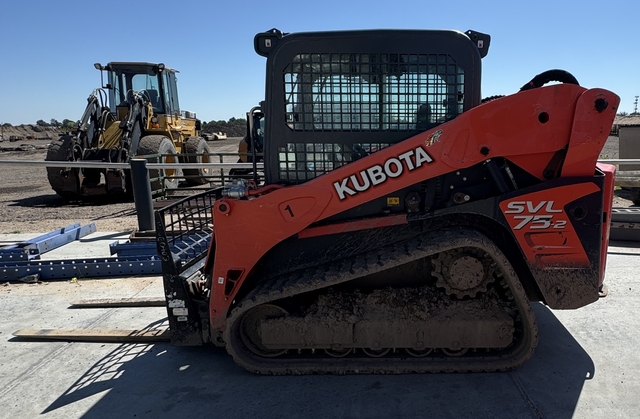 · Kabota SVL 75-2 Skid Steer w/ pallet forks 4inx48in., enclosed cab, 16in track, aux hyd, 4 cyl turbo diesel, 6434 total hrs, 100 hrs on new motor still under warranty