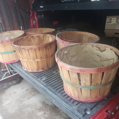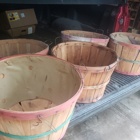 6 wooden baskets. I think they are a bushel each. The smaller isnt a bushel for sure.