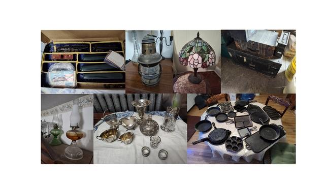 Antique & Vintage Collectibles - Large Collection of Cast Iron, Dual Retractable Double Shade Kerosine Lantern, Hand Stitched Quilts, Wool Trade Blanket, Oil Lamps, Handmade Crochet & Cross-stitch Fancy Ware Items, Childs Tea Set, Perfume Bottles, Shaving Kit, Crystal & Cut Glasses Vases-Bowls-Serving Pieces & Basket, GE Halfmoon Mantel Clock, Doll Bed - Head Vase, Monkey Wood Bowls, Cookie Cutters, Starr Coca-Cola Opener, Coffee Tin, Red & Green Wood Handle Kitchen Utensils, Food Chopper, Fur Coat, American West Double Holster Set, Gilbert American Flyer Train Set, Erector Set in Metal Case, Sterling Silver Plater-Glass & Silver Sorbet Dishes-Trinket Dish-Creamer & Sugar-Vases and more, Firestone Tire Store Portis, KS, Cloisonne Vases, Hand Cut Marble Vase, Beaded Purse, France Dessert China Sets, Hand Painted Porcelain Vases, Box Camera, Meat Grinders, Tea Ball Collection, Kirch Chef Wall Clock, Stainless Steel Kitchen Towel Holder, Cobalt Blue Juicer with Measuring Cup, Crock Bowls, Axe Sharpener, 1904 Tin Pie Safe, 5 Gal Crock, Oil Can, Metal Wagon Wheels, Victorian Fireplace Screen, Tom’s Glass Peanut Butter Sandwiches Jar, Enamel Chamber Pot, Fan, Coca-Cola Bottle Crate, Framed Stain Glass, Goodrich Tires-Double Sides Conoco Gasoline, Camelback and Flat Trunk