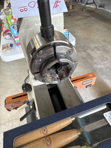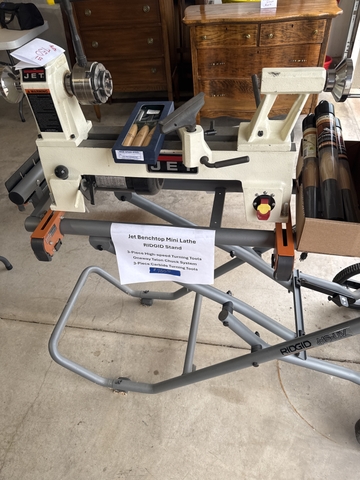 Jet mini lathe on foldable stand. Includes 3piece pen turning set, 3 piece mini carbide tool set and oneway talon chuck system. Cash only.