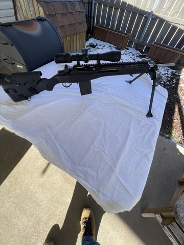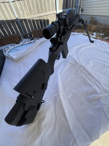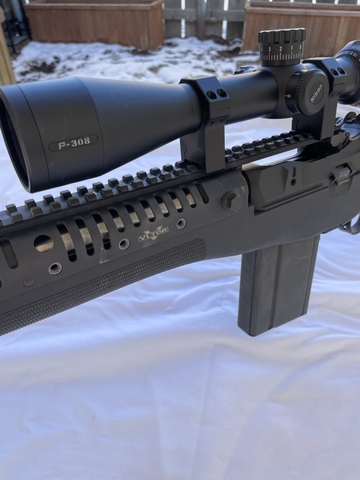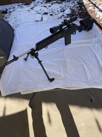 Comes with Nikon 3X9 BDC scope, 4 twenty round magazines, 1 five round magazine. Includes the factory bipod. Has a cheek riser on the stock so you can use the scope easily.